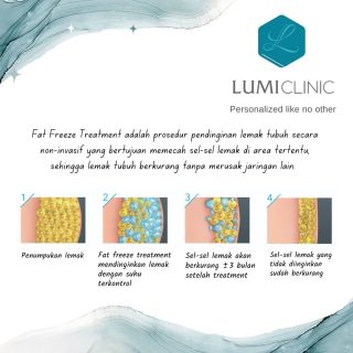 Fat Freeze Treatment is a method of fat freezing therapy commonly performed in specific parts of the body, such as the abdomen, thighs, and arms. During the treatment, the applicator will be placed on the skin which is later connected to the cooling panel. The cold sensation and the feeling of feeling will be felt for a few minutes during the treatment and will disappear on their own. The results of the Fat Freeze Treatment will be visible in a few months. It needs to be understood that Fat Freeze Treatment cannot make you lose weight overall (lose weight). This treatment is done to help reduce the accumulation of excess body fat in certain parts of the body. #cryolipolysis #lumiclinic #fatfreezetreatment